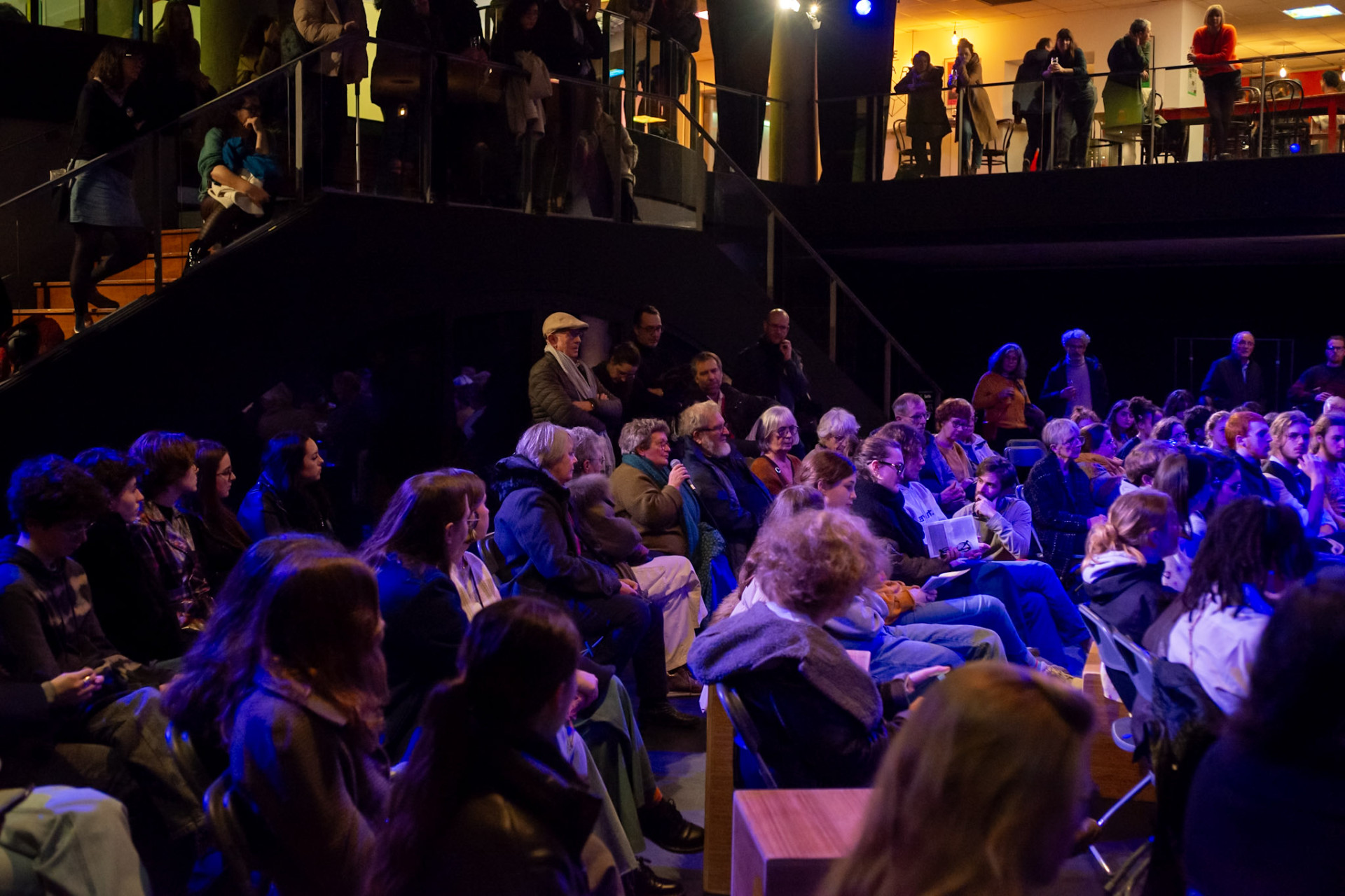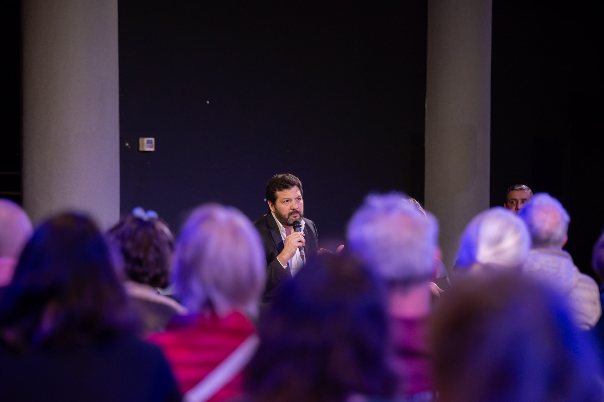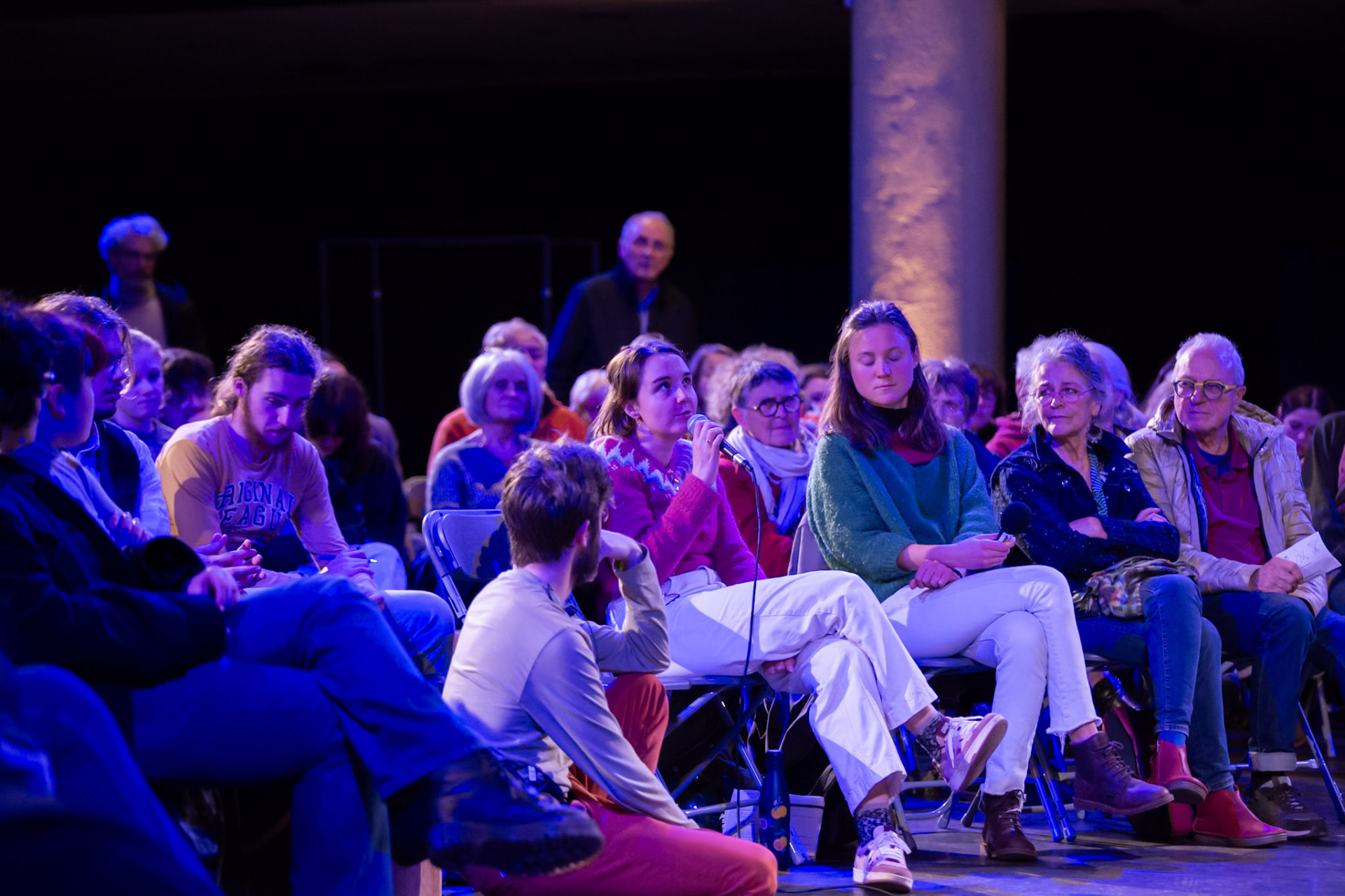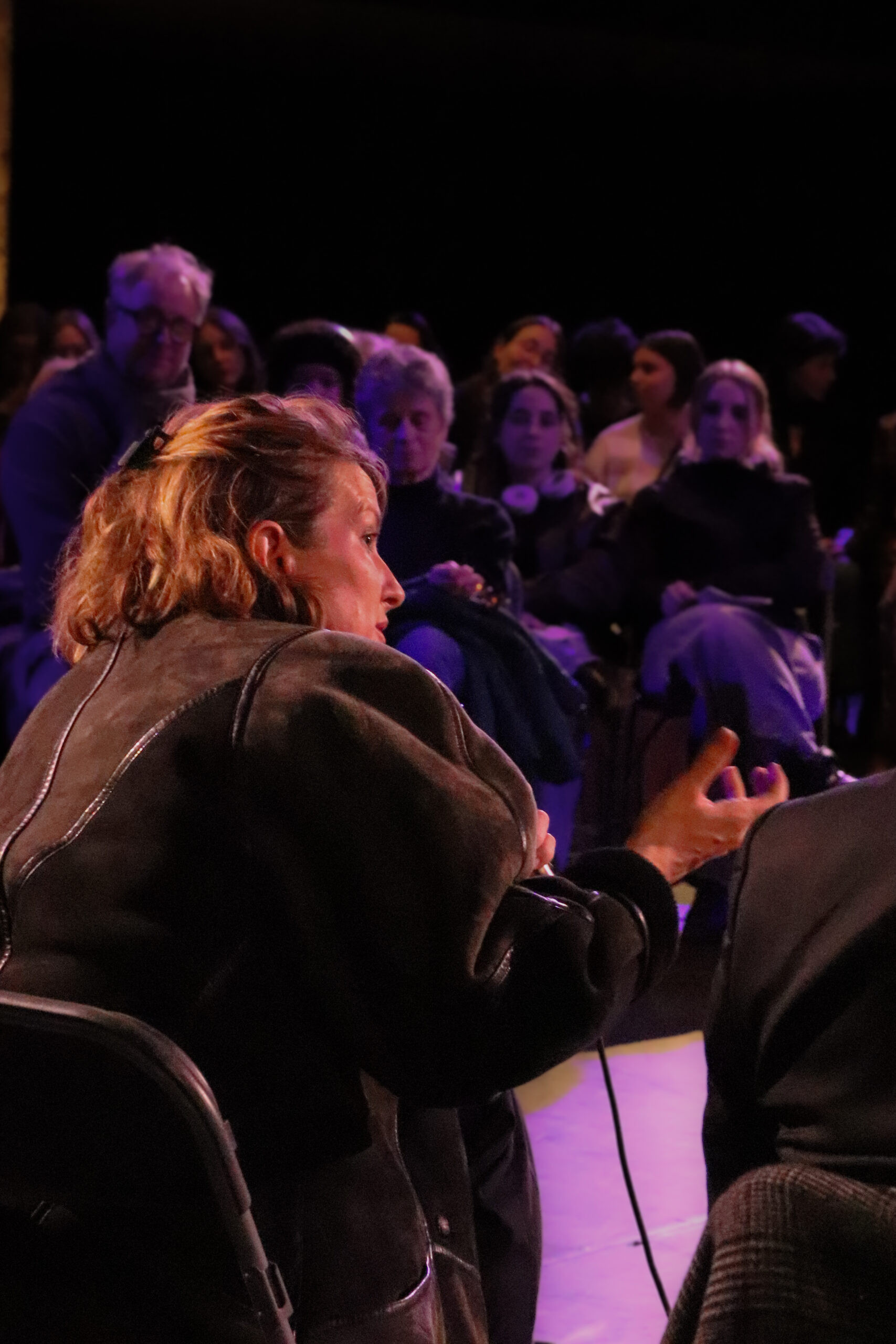 Jeudi 5 décembre, à l’issue de la représentation de Léviathan, un temps d’échange a été proposé au public avec Lorraine de Sagazan, metteure en scène du spectacle, Arié Alimi, avocat et vice-président de la Ligue des Droits de l’Homme, Étienne Obriot, co-président de l’antenne briochine de la Ligue des droits de l’Homme et Khallaf Barah, comédien et témoin dans Léviathan.