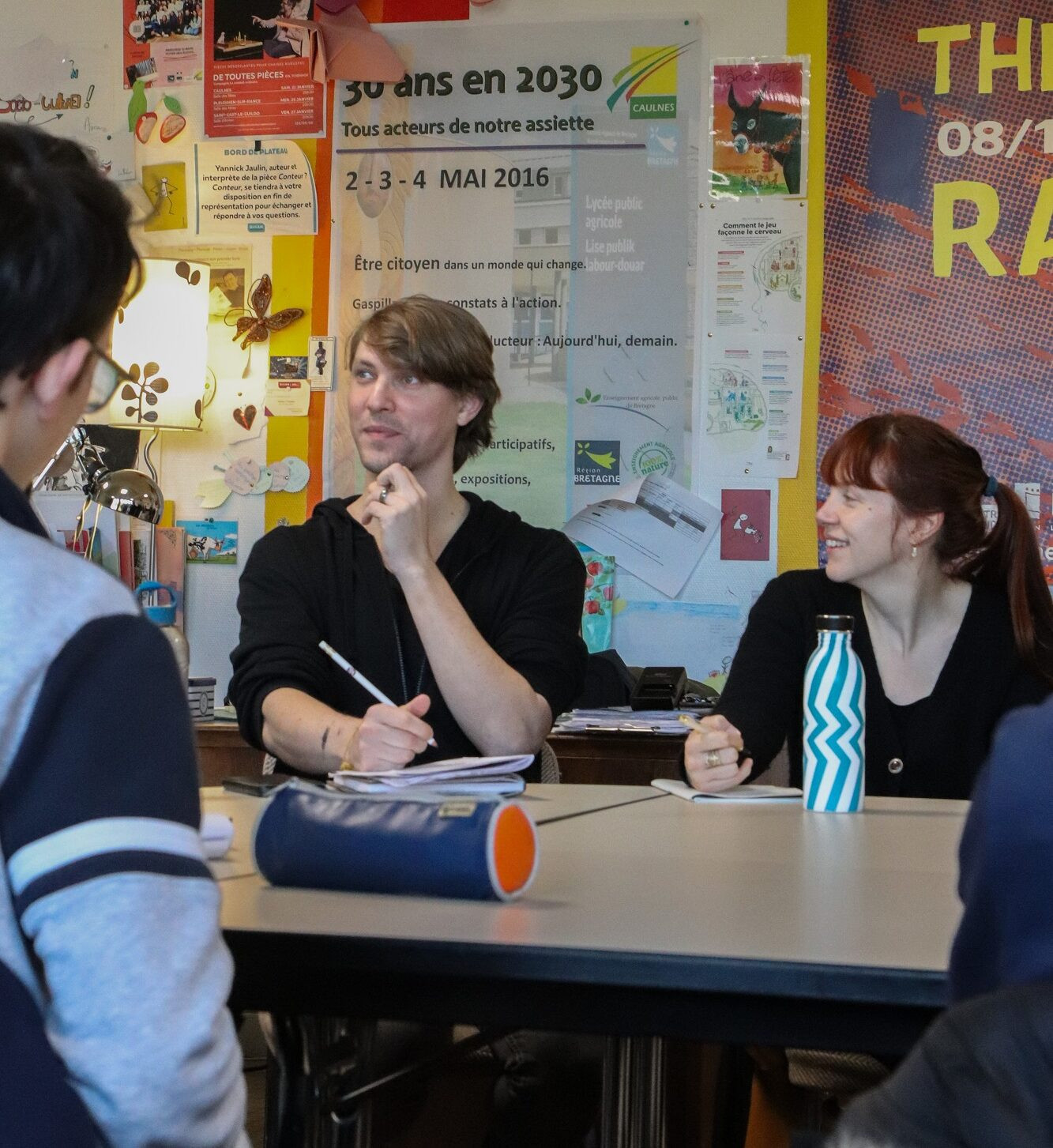 Photographie 1 : Mathieu Ehrhard et Roxane Brumachon du Collectif OS’O lors de leur semaine d’ateliers au Lycée agricole de Caulnes.
