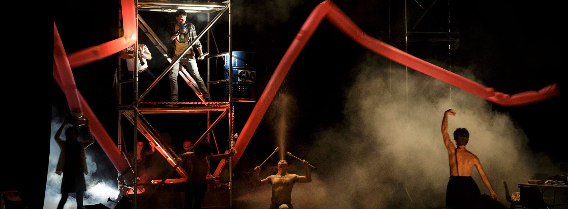 La mort d’un végétarien assommé par un gigot congelé, des traces sanglantes sur les murs, des cris d’effroi en coulisses… La bande des 26000 Couverts, venue du théâtre de rue, s’attache, avec cette création, à célébrer la risible absurdité de la mort. L’intention de départ semble toutefois avoir du plomb dans l’aile : le metteur en scène a disparu, son idée de procession macabre avec marionnette géante n’est pas vraiment calée, les installations de feux pas sécurisées…