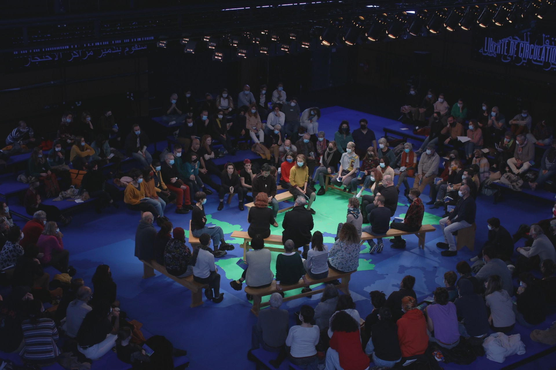 Dans un espace quadri-frontal en perpétuelle métamorphose, Patricia Allio crée une agora vivante qui rend poreuse la frontière entre l’art et le militantisme. Et nous invite à nous y asseoir pour inventer un autre monde.