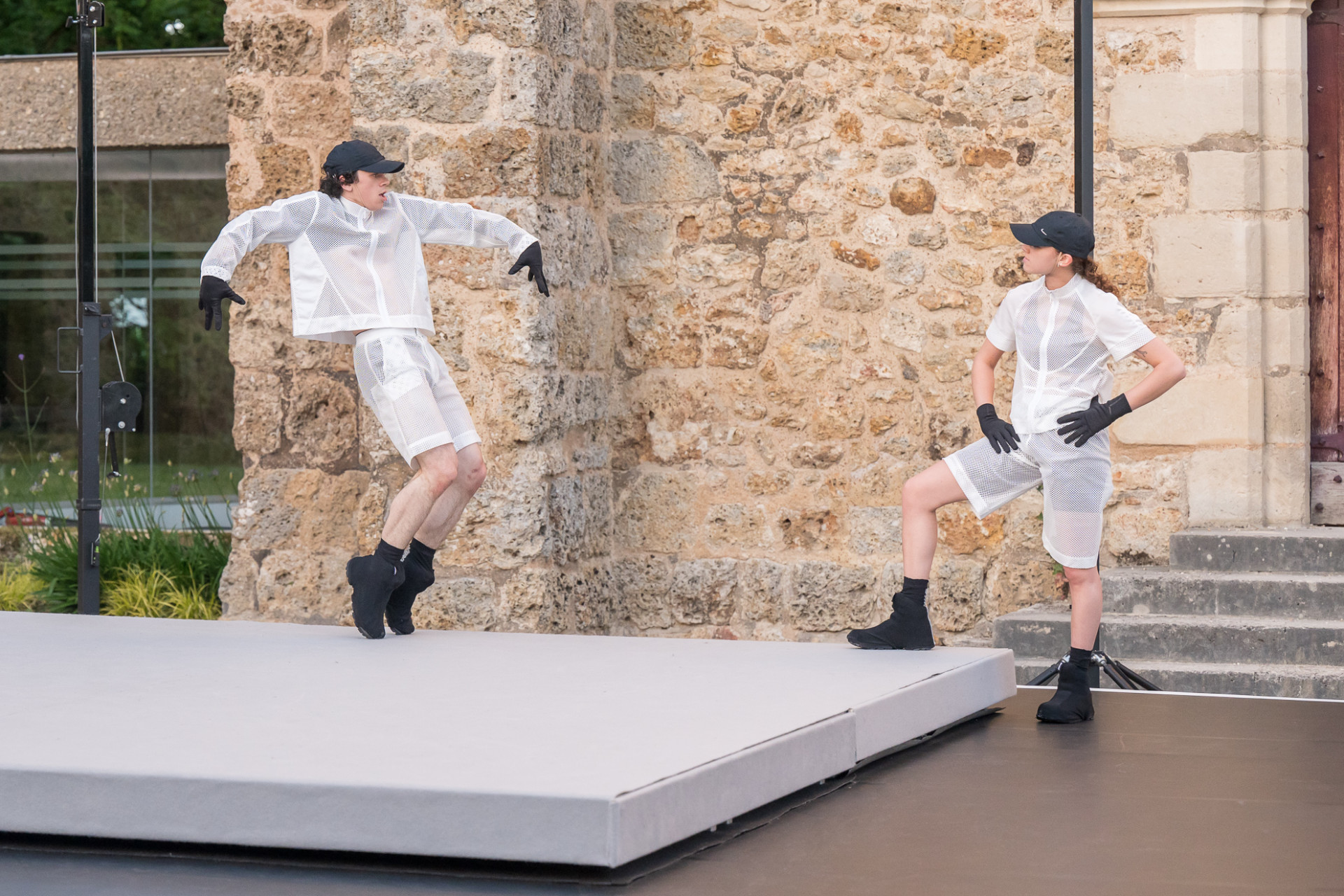 Deux personnages en casquette, short blanc unisexe et bottes noires épaisses, sautent sur l’estrade blanche comme on conquiert un nouvel espace. Sur la Fantaisie en fa mineur de Schubert, la joute complice, faite de tressautements permanents, d’attitudes cartoonesques et de piqués sur des chaussures devenues pointes, ravive l’esprit fraternel et compétitif des battles. De postures comiques en portés audacieux, les codes des danses urbaines en sortent regénérés.