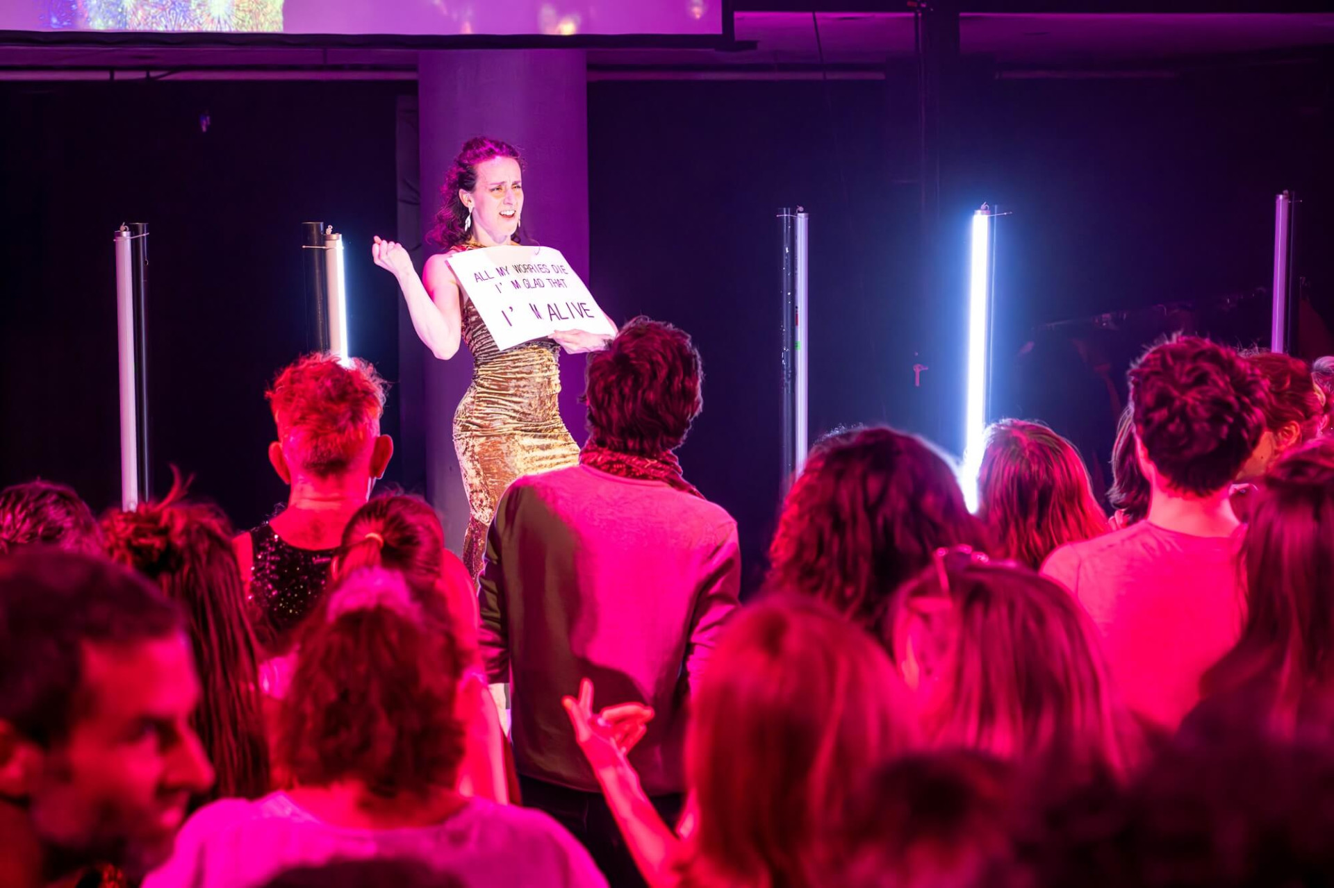Comme au vrai karaoké, les paroles défilent sur un écran géant… À ce détail près qu’en plus de chanter en chœur, on vous invite à bouger et à devenir les stars des clips originaux projetés. Dans ce spectacle hybride qui n’en finit plus de faire des émules depuis 2018, les performances sont impulsées tout à la fois par les danseur·se·s du Collectif ÈS et par des participant·e·s infiltré·e·s. Quant à la liste des chansons proposées, elle navigue entre tubes vintage – Bee Gees, Diam’s – et Beyoncé, pour être assurée d’emporter toutes les générations.