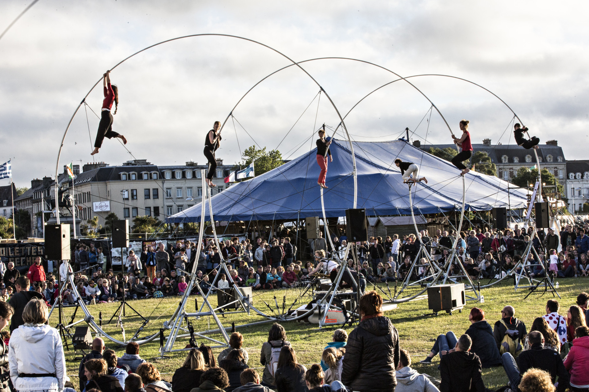 La spire : c’est ainsi que Chloé Moglia nomme la monumentale spirale en filin d’acier conçue pour ce spectacle. Trois boucles de 6,5 mètres de hauteur et 18 de longueur : une structure-sculpture colossale et légère, comme un trait de pinceau dessiné dans le paysage. L’objet, en soit, fait déjà œuvre d’art. Célestes, les cinq interprètes s’y accrochent, se croisent, s’élèvent, le traversent et tracent des circonvolutions comme des planètes dans un univers en mouvement.