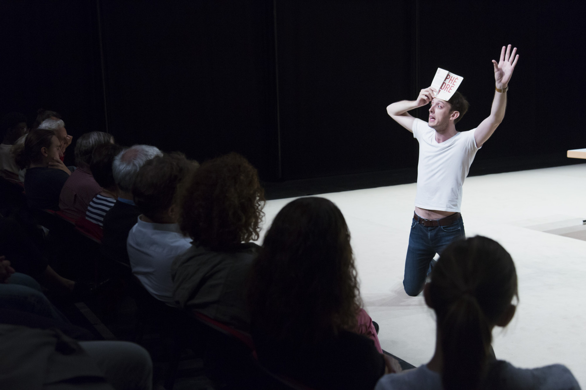 Une table, une chaise et un livre pour seul accessoire : avec trois fois rien mais un interprète remarquable, François Gremaud dessine une Phèdre iconique. Facétieux et blagueur, le metteur en scène revisite la vie et la mort de la seconde femme de Thésée, roi d’Athènes, à travers ses désormais célèbres conférences-spectacles consacrées aux figures féminines tragiques. L’allure d’un prof débutant, Romain Daroles présente, ouvrage en main, le texte de Racine. Avec un enthousiasme réjouissant, peu à peu emporté par sa passion des alexandrins, il se prend à jouer tous les personnages, et ce faisant la pièce entière, acte par acte… Une époustouflante performance d’acteur, tout entier habité du bonheur complice de partager sa passion pour Racine.