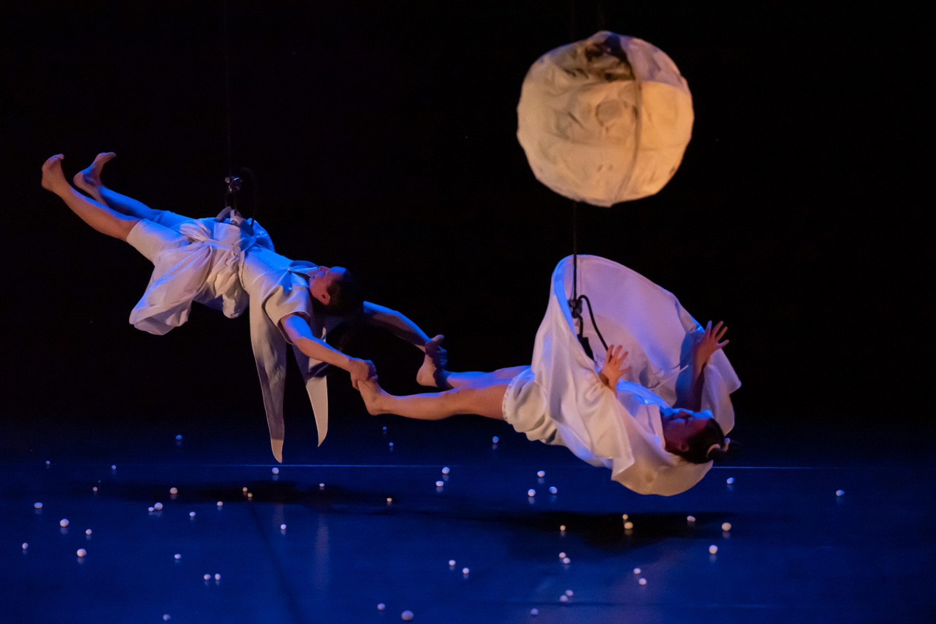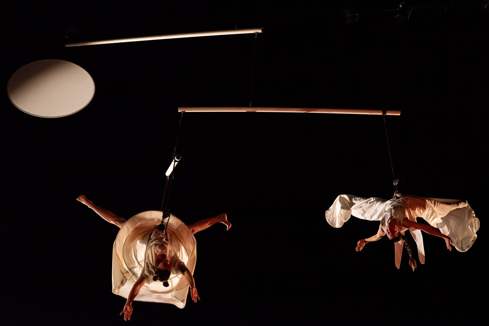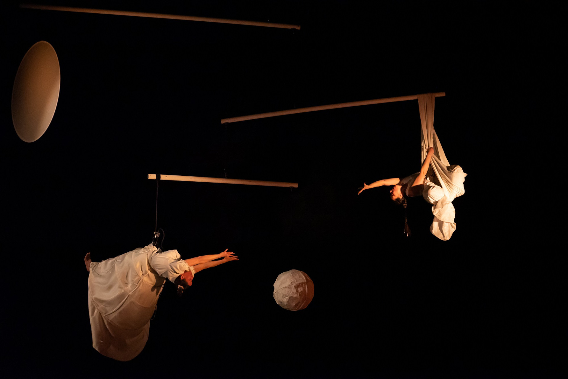 Imaginez deux êtres suspendus sur un mobile géant. Si l’un bouge, l’autre aussi. Chacun apparait, disparait pour nous emporter hors du temps. Ce spectacle est une ode à l’imagination et à la magie de l’enfance, une bulle d’air dans notre monde de plus en plus en ébullition. Un moment onirique pour les plus petits qui ravira, c’est certain, les grands enfants qui sommeillent en chacun de nous.